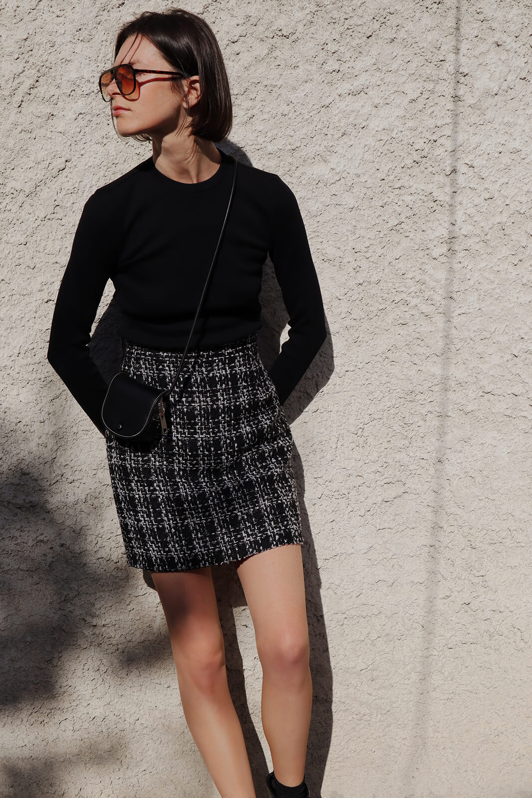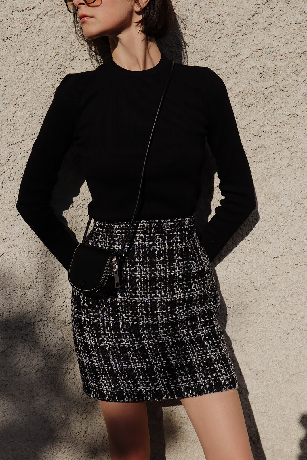 Black and white tweed mini skirt