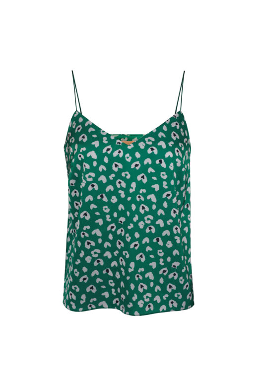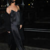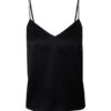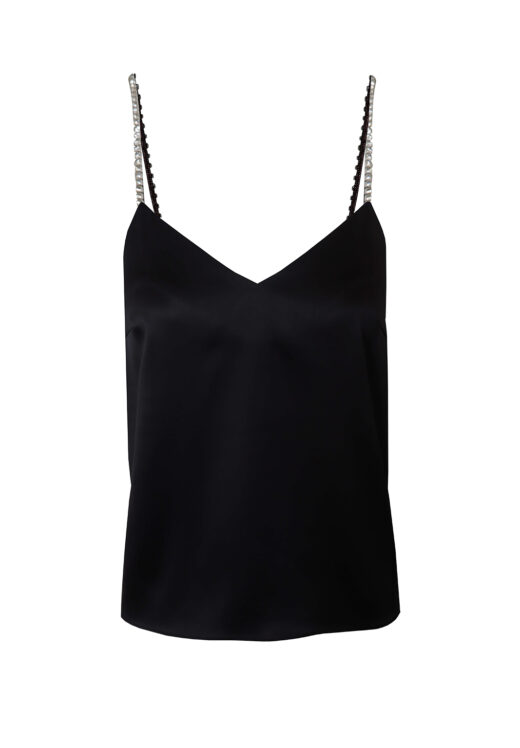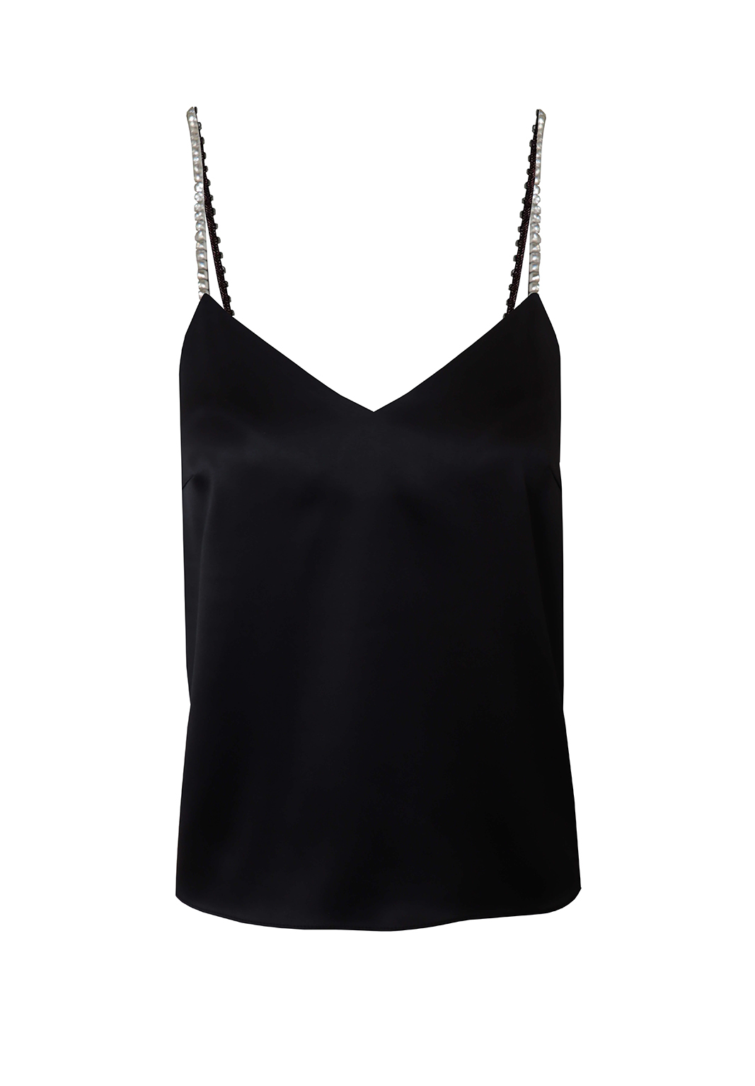 This top is cut from black satin with crystal-embellished skinny shoulder straps.