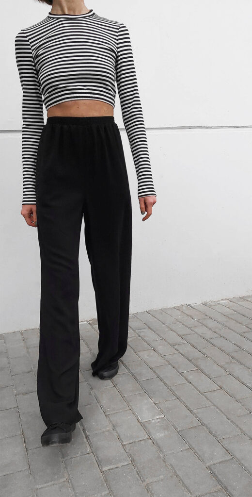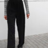 This trousers has gathered elastic waistband and side pockets.